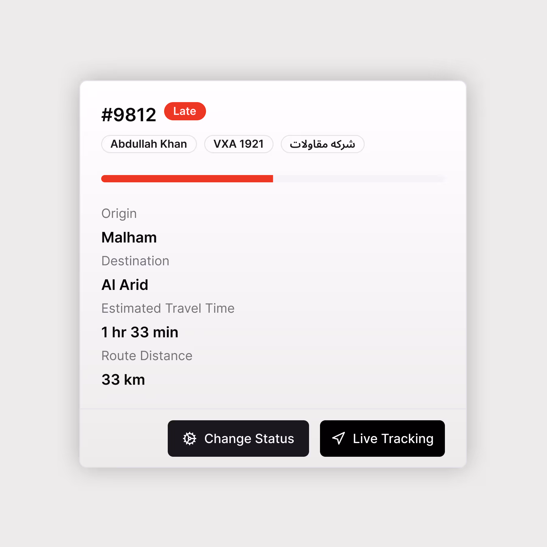 You monitor the entire fleet from a single interface featuring dynamic proximity loaders that visualize exactly how close a driver is to the destination. The system uses predictive algorithms to automatically tag and flag "LATE" shipments the moment a truck falls behind schedule, giving you pre-emptive control.